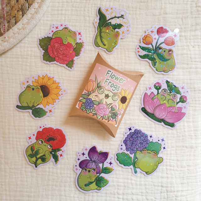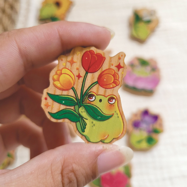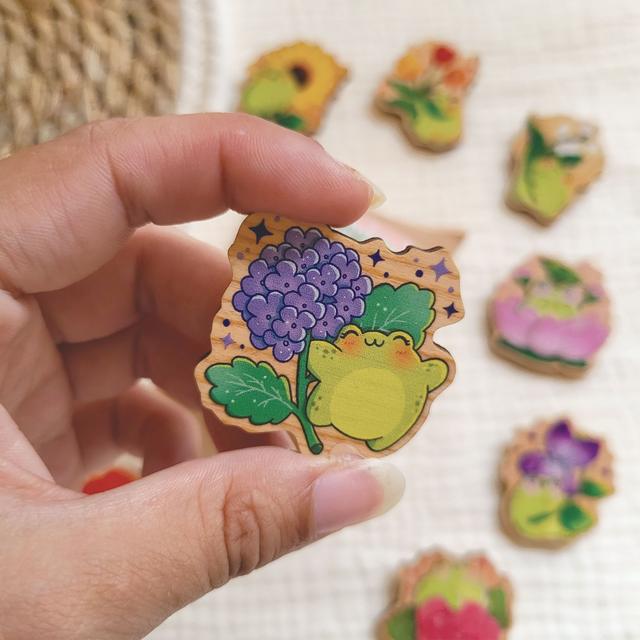 Boîtes mystère contenant 1 pin en bois et son sticker assorti. Chaque design a 1/8 chance d'être découvert.