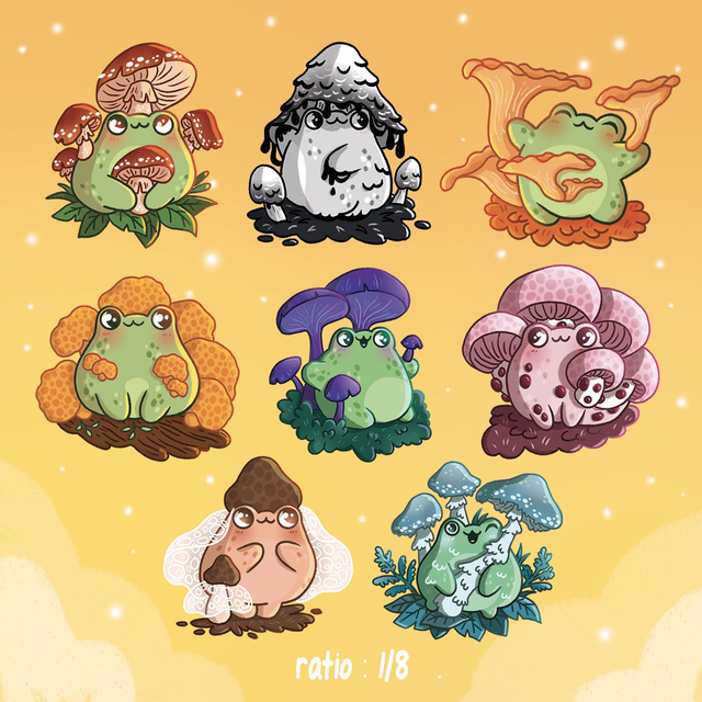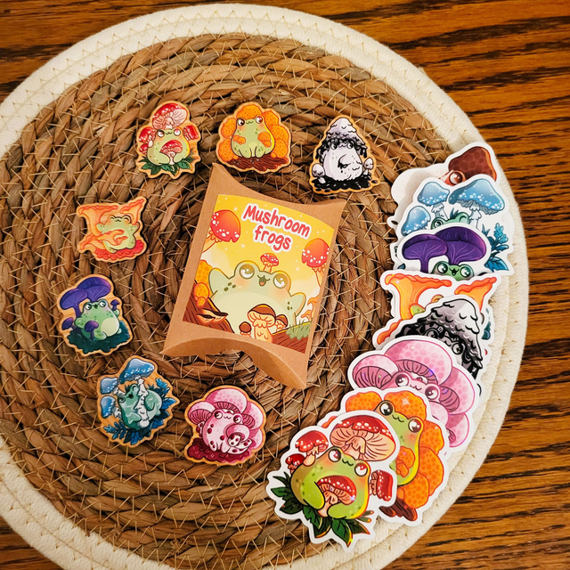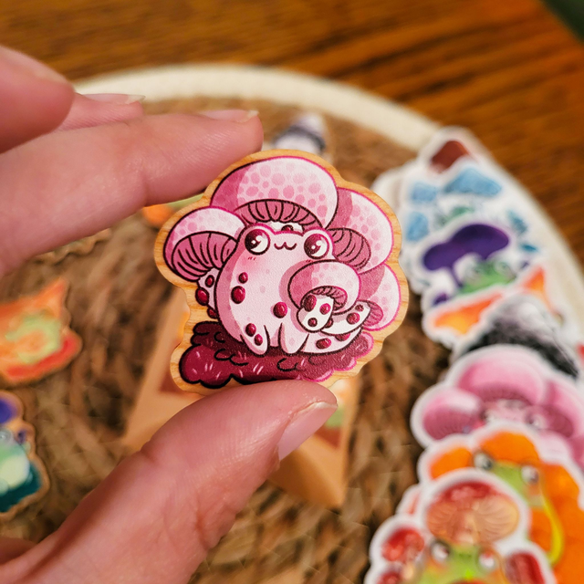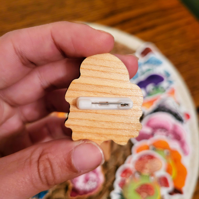 Chaque boîte mystère contient 1 broche en bois ( taille 3,8cm environ) et son sticker ( 6,3cm ) .