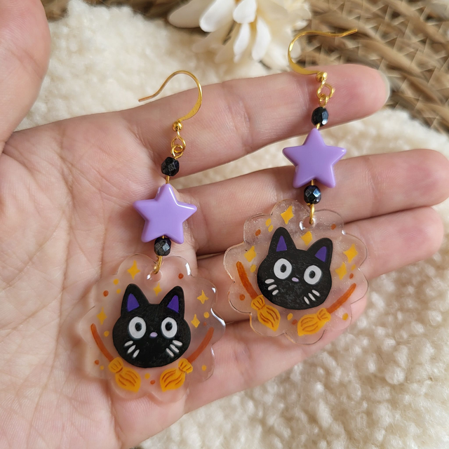 Boucle d'oreille en plastique fou, avec une couche de résine sur la face. Longeur: 6,5cm environ